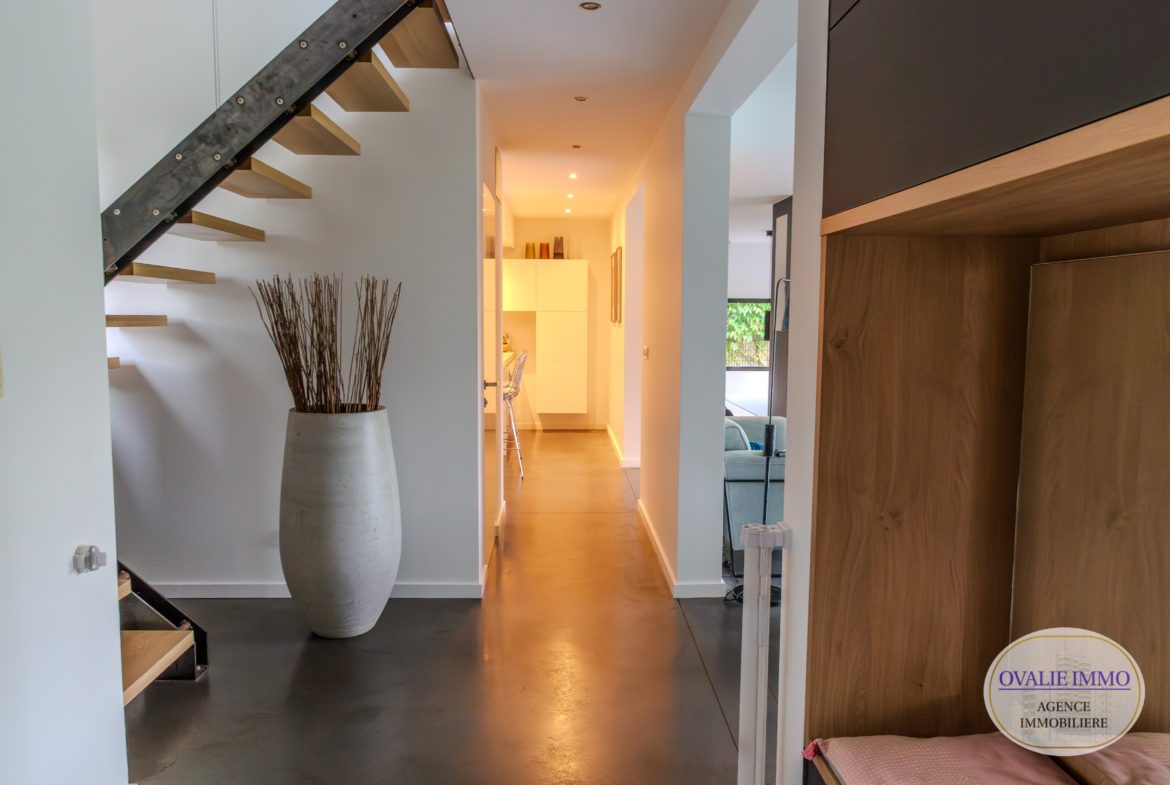 Dès l’entrée, on est happé par la qualité des matériaux et la justesse de l’architecture d’intérieur où tout a été pensé dans les moindres détails. On entre dans un vaste hall avec vestiaire qui vous dirige sur un espace de vie avec sa salle à manger, sa cuisine ouverte, sa cheminée et ses salons. Une vue sans vis à vis sur le jardin permet de profiter d’un espace naturel reposant et calme de près de 1 000 m² avec sa piscine inox, sa grande terrasse de 80 m² et son terrain de pétanque.